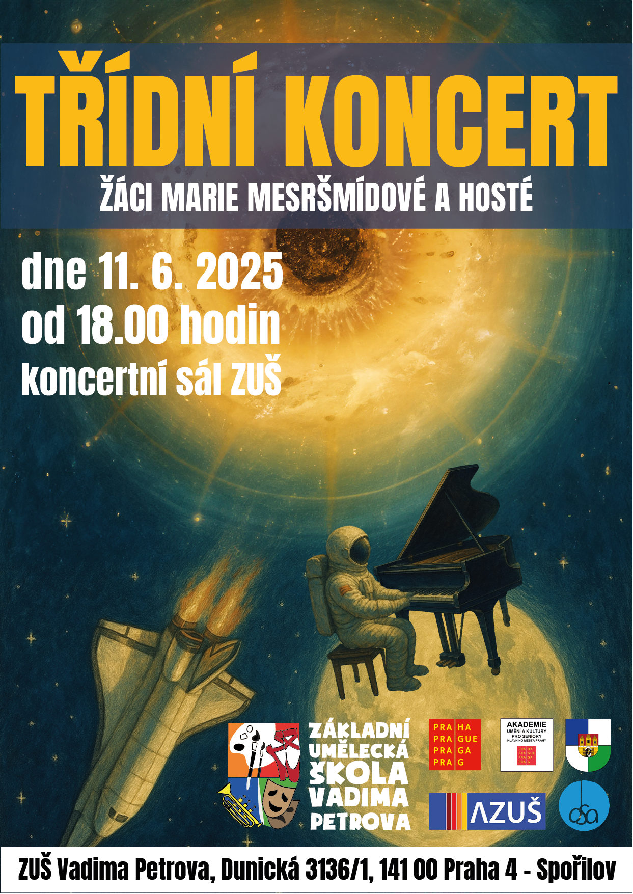 - 11. 6. 2025 - Třídní koncert žáků Marie Mesršmídové od 18.00 hodin;