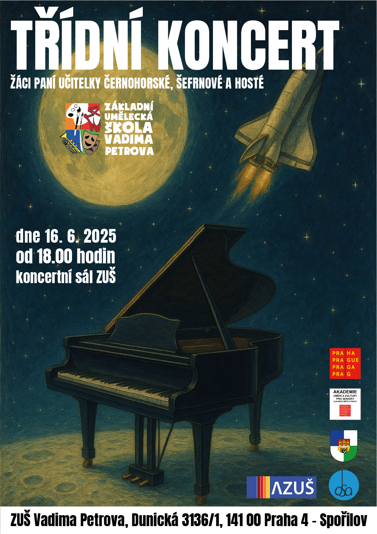 - 16. 6. 2025 - Třídní koncert žáků paní učitelky Černohorské a Šefrnové od 18.00 hodin;
