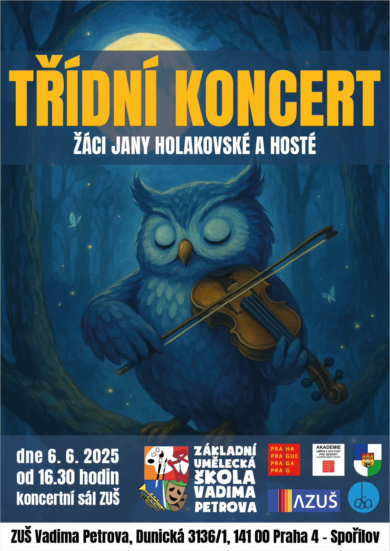 - 6. 6. 2025- Třídní koncert žáků Jany Holakovské (Jírů) od 16.30 hodin;