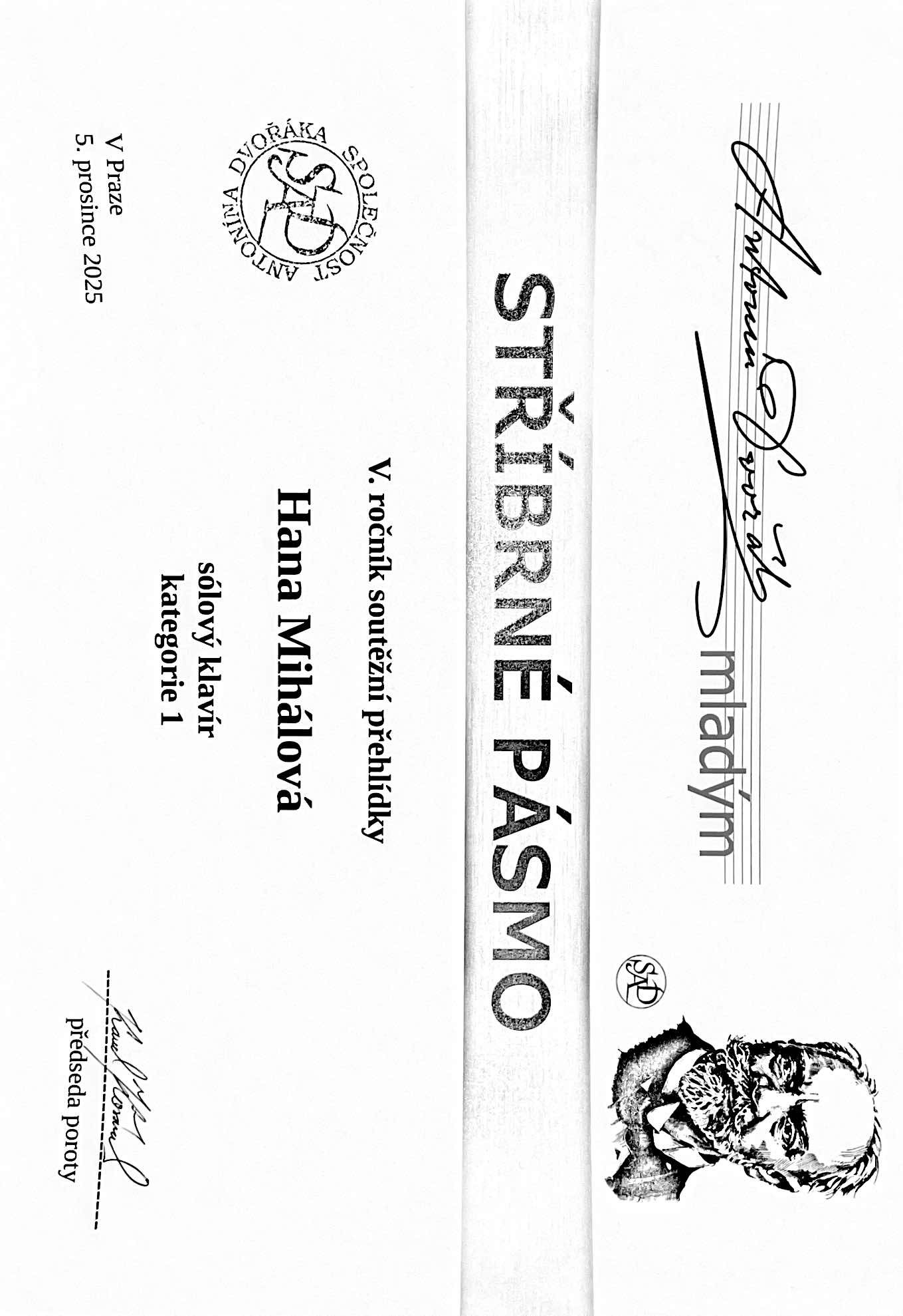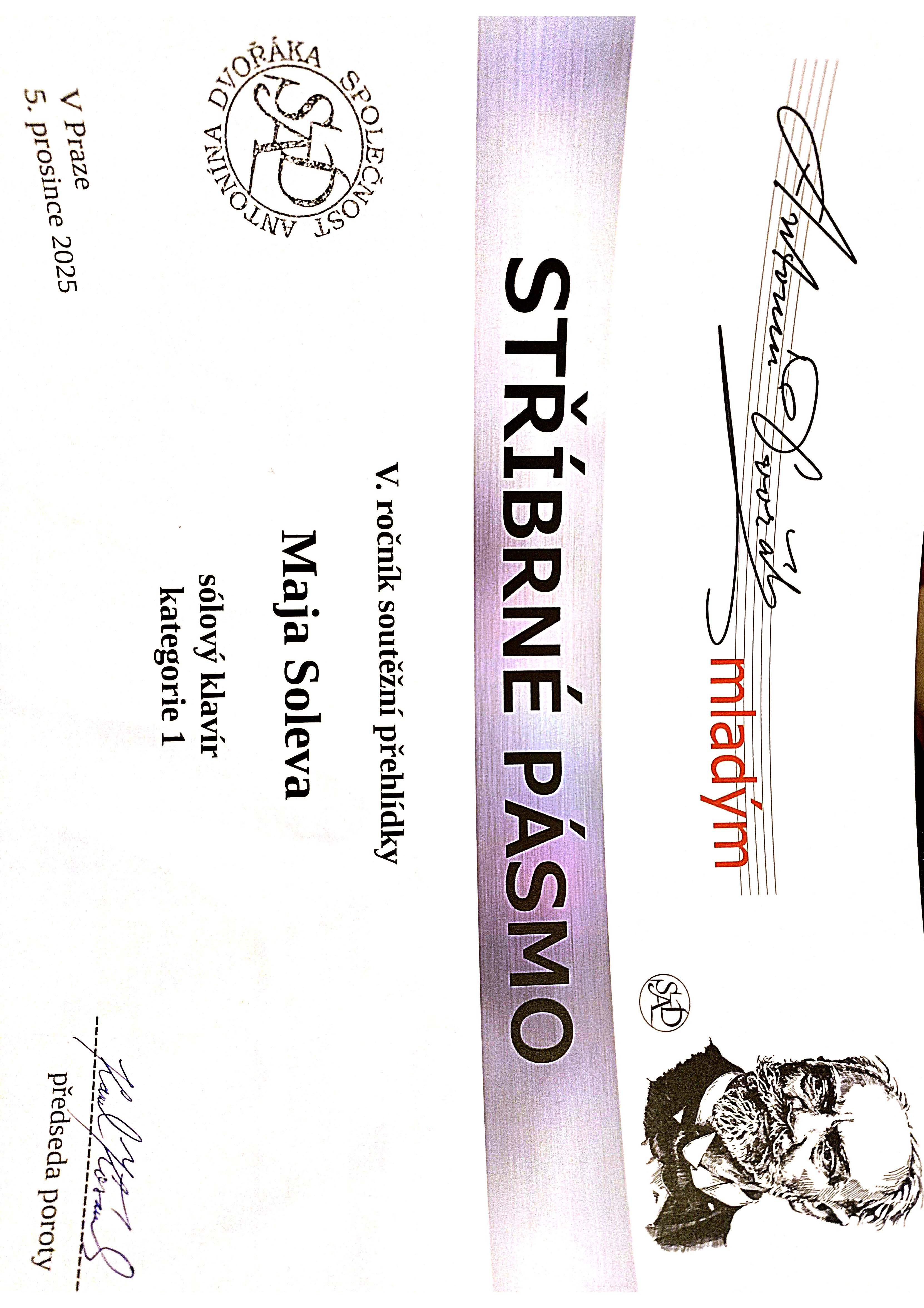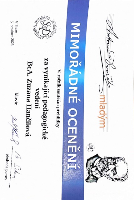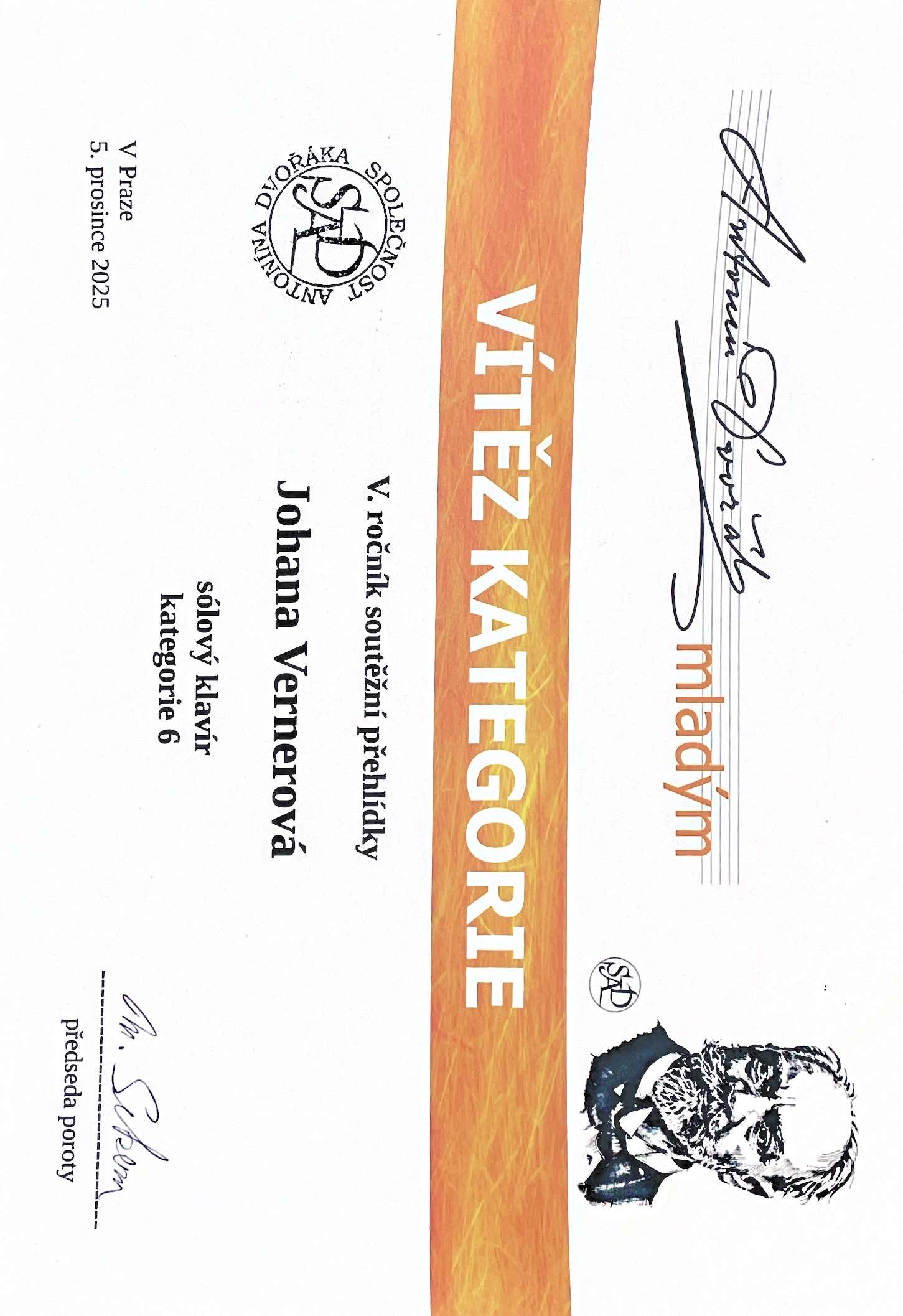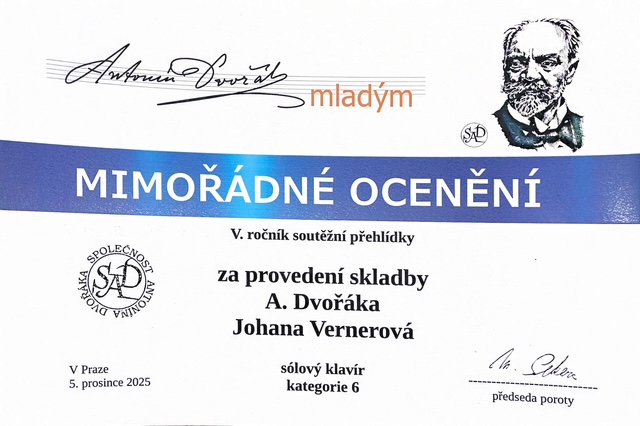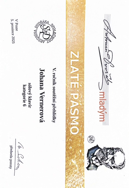 - Johana Vernerová - dostala 3 ocenění: zlaté pásmo, diplom za vítěze kategorie, diplom za provedení skladby A. Dvořáka